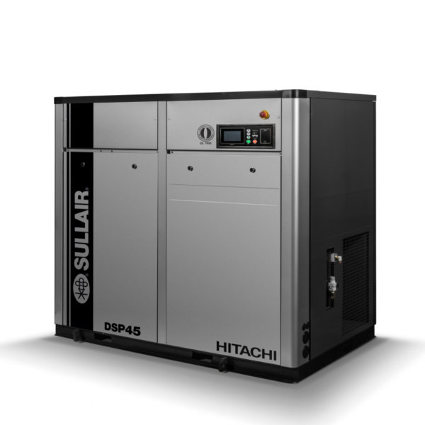Hitachi, Tokyo, 1910, brings motors from a railway traction platform to oil-free screw compression. Thermal growth management between rotors and housings is the central problem in oil-free, and Hitachi's approach draws on precision rotating equipment engineering from its other industrial divisions. Below 62 dBA through source-level design. Labs, hospitals, semiconductor fabs.